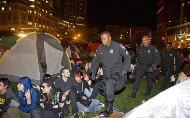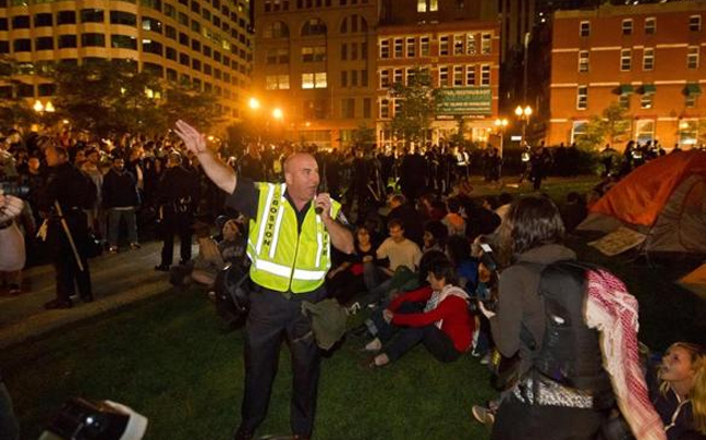 Περίπου 200 αστυνομικοί περικύκλωσαν λίγο μετά τα μεσάνυχτα την πλατεία που είχαν καταλάβει οι διαδηλωτές, εμπνεόμενοι από το κίνημα «Καταλάβατε την Γουόλ Στριτ» και τους ζήτησαν να διαλυθούν. Όταν εκείνοι αρνήθηκαν, τους έσυραν στο έδαφος, πριν τους περάσουν χειροπέδες και τους απομακρύνουν, γράφει η εφημερίδα Boston Globe. Οι διαδηλωτές φώναζαν στη διάρκεια της επιχείρησης συνθήματα όπως «λαός ενωμένος ποτέ νικημένος», «ειρηνική διαδήλωση» και «όλος ο κόσμος βλέπει».