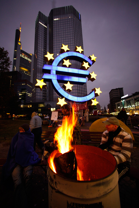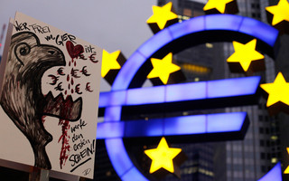 «Ο Αναμάρτητος πρώτος το λίθο βαλέτω» γράφουν στο πλακάτ που σήκωσαν οι διαδηλωτές έξω από την Ευρωπαϊκή Κεντρική Τράπεζα στη Φρανκφούρτη.