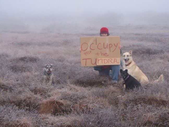 Την ώρα που χιλιάδες πολίτες συγκεντρώνονται σε διάφορα αστικά κέντρα, στο πλαίσιο του παγκόσμιου κινήματος «Occupy», η Diane McEachern, διαμαρτύρεται παρέα με τα σκυλιά της κρατώντας μια ταμπέλα στην ερημιά της τούνδρας της Αλάσκας.
