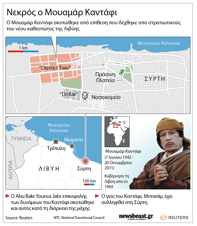 Μετά από πολύμηνες συγκρούσεις με τις πιστές στον άλλοτε ισχυρό ηγέτη της Λιβύης, Μουαμάρ Καντάφι, οι αντικαθεστωτικοί κατάφεραν να τον εντοπίσουν και να τον σκοτώσουν στη γενέτειρά του τη Σύρτη.