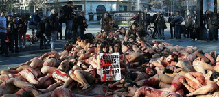 Δεκάδες διαδηλωτές γυμνοί κι έχοντας βάψει το κορμί τους με κόκκινη μπογιά για να αναπαραστήσουν το αίμα, συγκεντρώθηκαν σήμερα στο κέντρο της Βαρκελώνης για να διαμαρτυρηθούν για την κατασκευή ενδυμάτων από γούνα.