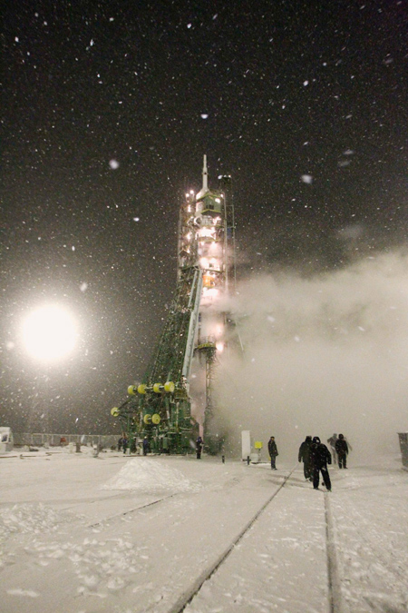 Ο πύραυλος Soyuz-FG, μεταφέροντας τον Αμερικανό Νταν Μπέρμπανκ και τους Ρώσους Αντον Σκαπλέροφ και Ανατόλι Ιβανίσιν, εκτοξεύτηκε επιτυχώς από το κοσμοδρόμιο του Μπαϊκονούρ στο Καζακστάν.