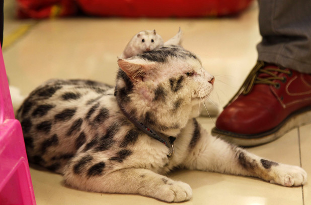 Πάει, χάλασε ο κόσμος! Η καλοπέραση έχει κάνει κάποιες γάτες αρκετά μαλθακές, αλλά αυτό μάλλον ξεπερνά τα όρια! Ο Νινγκ, ο γάτος της φωτογραφίας, κάθεται ατάραχος και αγέρωχος, τη στιγμή που στο κεφάλι του κόβει βόλτες ένα χάμστερ. Η συνέχεια της φωτογραφίας θα μπορούσε να παρουσιάζει τον Νινγκ με το χάμστερ ανάμεσα στα σαγόνια του, όμως σύμφωνα με πληροφορίες, ο γάτος, ο οποίος είναι μασκότ σε pet shop της Κίνας, άφησε το συμπαθές τρωκτικό να… ολοκληρώσει τη βόλτα του με την ησυχία του.