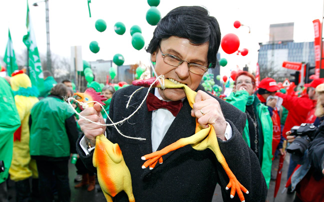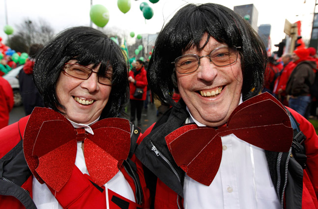 Οι διαδηλωτές είναι μεταμφιεσμένοι σε… Έλιο ντι Ρούπο, τον επικεφαλής των σοσιαλιστών που αναμένεται να είναι ο επόμενος πρωθυπουργός.