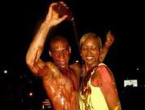 Σε αυτή φαίνεται η Sharron Smalls δίπλα σε έναν ημίγυμνο άντρα, ο οποίος ρίχνει επάνω της ένα σκούρο υγρό.