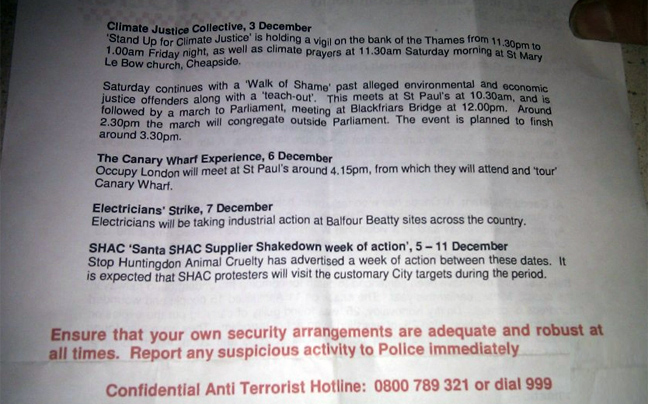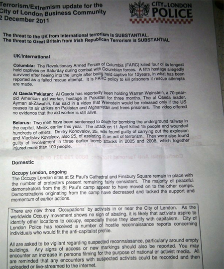 «Λόγο ανησυχίας» αποτελεί για την αστυνομία του Λονδίνου το κίνημα Occupy London, το οποίο κατατάσσεται σε λίστα με τις τρομοκρατικές κινήσεις της πόλης, που εστάλη σε διάφορες επιχειρήσεις.