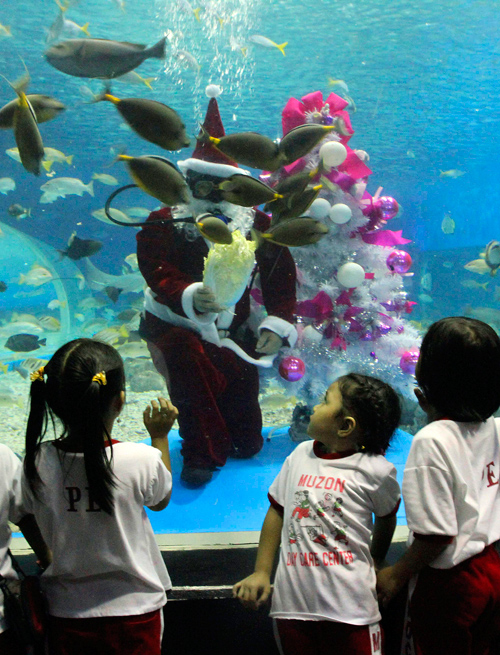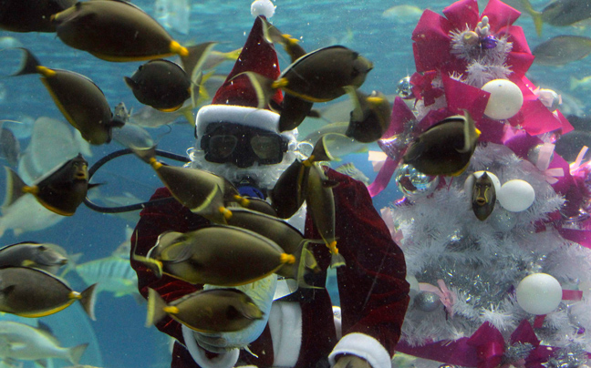 Ο Άγιος Βασίλης δεν πτοείται από το νερό. Βουτάει και στολίζει το… υποβρύχιο χριστουγεννιάτικο δέντρο καθώς το ενυδρείο Ocean Park στη Μανίλα των Φιλιππίνων ετοιμάζεται για τα Χριστούγεννα.