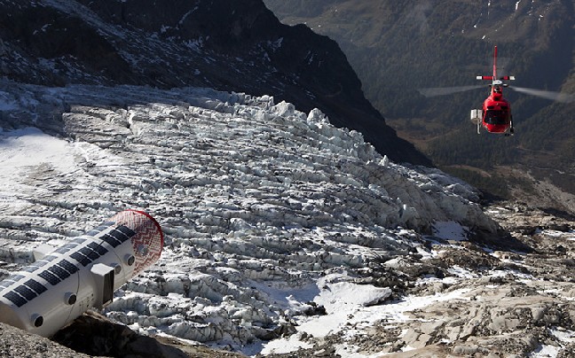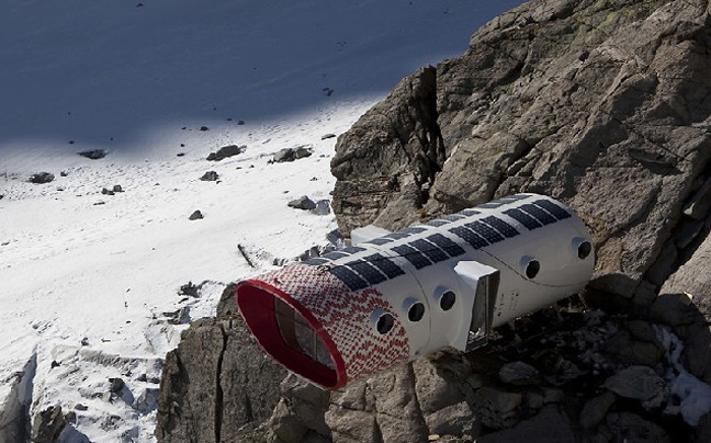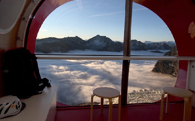 Το Gervasutti, όμως, δεν είναι ένα απλό καταφύγιο. Κρέμεται από την άκρη ενός βράχου, μοιάζει με πύραυλο και το έχουν ζωγραφίσει σε έντονο κόκκινο χρώμα, που το κάνει να μοιάζει με πουλόβερ!
