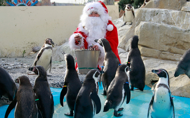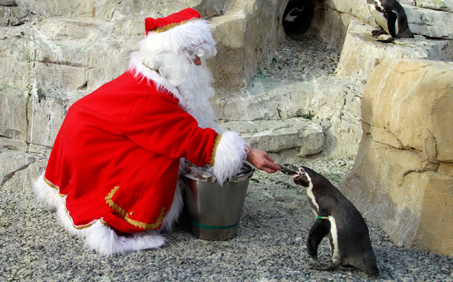 ο Άγιος Βασίλης φόρεσε την κόκκινη φορεσιά του και το σκουφί του, έριξε στον ώμο το σάκο με τα… ψάρια και μπήκε στο χώρο όπου ζουν οι πιγκουίνοι στο θαλάσσιο πάρκο Marineland στη νοτιοανατολική Γαλλία.