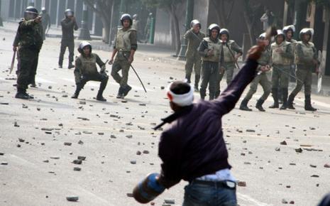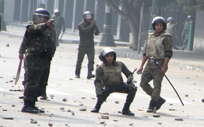 Με τους διαδηλωτές μόλις λίγα μέτρα μακριά του, ο αιγύπτιος στρατιώτης σηκώνει το όπλο και σημαδεύει απευθείας.