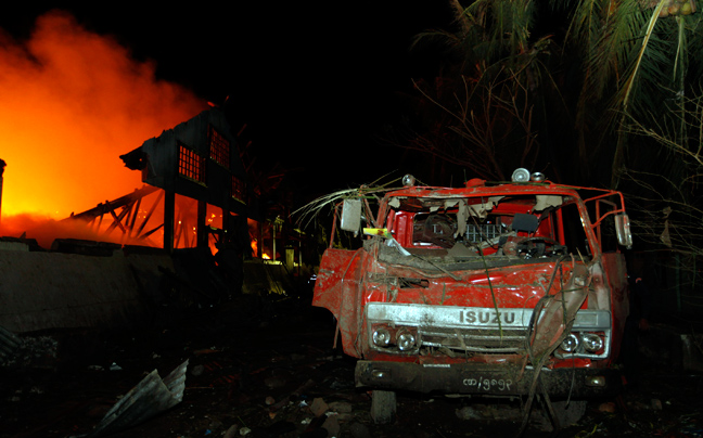 Από τις εκρήξεις δημιουργήθηκε μεγάλος κρατήρας και περίπου πενήντα σπίτια, στην πλειοψηφία τους ξύλινα, όπως και ένα βουδιστικό μοναστήρι καταστράφηκαν από τη φωτιά που τέθηκε υπό έλεγχο τη νύχτα.