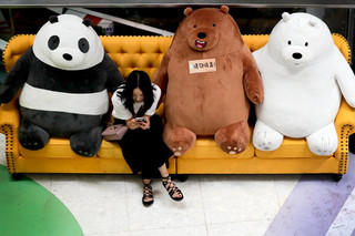 Μία γυναίκα από την Κίνα έχει «βυθιστεί» στο smartphone της, ενώ κάθεται σε έναν καναπέ με τρία πελώρια λούτρινα ζωάκια σε ένα εμπορικό κέντρο στο Πεκίνο.
