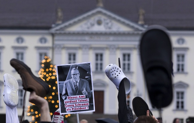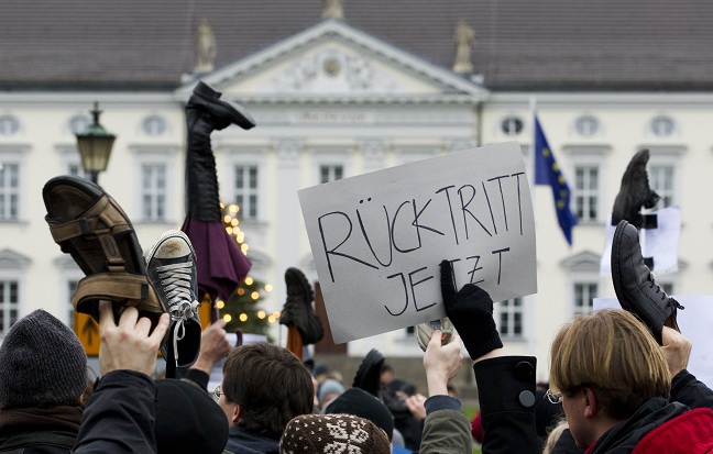 Στην αρχή ήταν ο Τζορτζ Μπους, μετά ο Μαχμούντ Αχμαντινετζάντ κι ακολούθησαν κι άλλοι. Τώρα ήρθε και η σειρά του Γερμανού προέδρου, Κρίστιαν Βουλφ. Το αραβικό έθιμο της έκφρασης δυσαρέσκειας κι αποδοκιμασίας από την αραβική παράδοση έφτασε και στη Γερμανία. Περίπου 150 άνθρωποι, πήραν τα παπούτσια στο χέρι και μαζεύτηκαν έξω από την κατοικία του Γερμανού προέδρου Κρίστιαν Βουλφ θέλοντας έτσι να εκφράσουν την αγανάκτησή τους για τα σκάνδαλα που βλέπουν τις τελευταίες μέρες το φως της δημοσιότητας. Οι διαδηλωτές συγκεντρώθηκαν στο πεζοδρόμιο μπροστά από την προεδρική κατοικία και οργανώθηκαν μέσω του Facebook με σλόγκαν τους: “Δείξτε στον Βουλφ τα παπούτσια σας- Ένα παπούτσι για εσάς κύριε Πρόεδρε!”