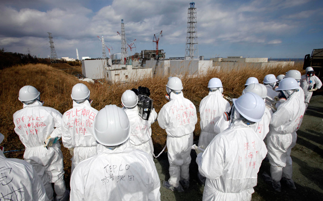 Εκπρόσωποι των ΜΜΕ- με όλη την απαραίτητη «εξάρτυση», στολές, μάσκες, κλπ- μπήκαν στο κατεστραμμένο εργοστάσιο συνοδευόμενοι από εργαζόμενους της διαχειρίστρια εταιρείας Tokyo Electric Power.