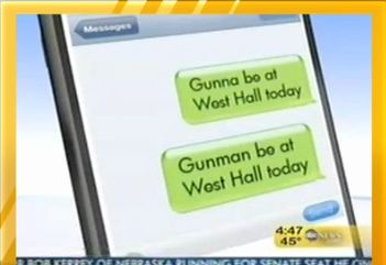 Το μήνυμα κανονικά θα έπρεπε να έλεγε : «gonna be at west hall today» (θα είμαι στο west hall σήμερα). Όμως, το σύστημα autocorrect του smartphone που χρησιμοποιούσε ο αποστολέας, πήρε… πρωτοβουλία και άλλαξε τη λέξη «gonna» με τη λέξη «gunman» που σημαίνει «ένοπλος».