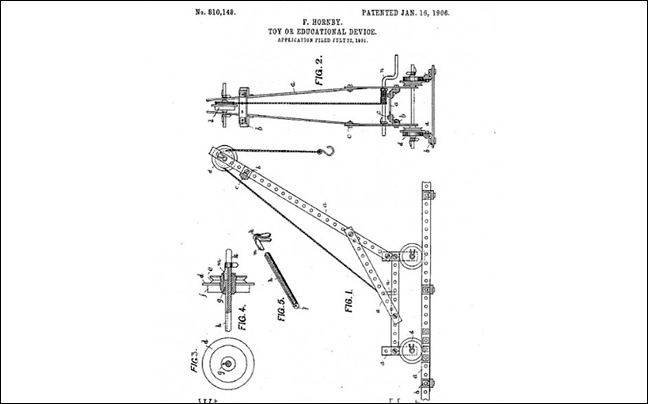 Παιχνίδια ή εκπαιδευτικές συσκευές, στα Meccano χορηγήθηκε η πατέντα το 1906. Πρόκειται για επιτυχία του Franck Hornby, ο οποίος είναι ο άντρας που βρίσκεται και πίσω από τα παιχνίδια Dinky και Hornby Model Railways.