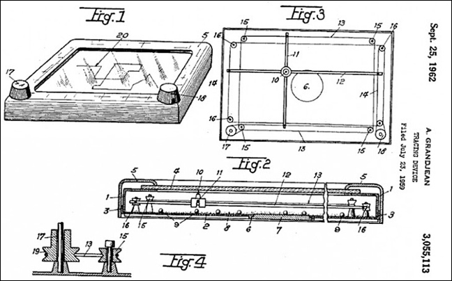 Σε ένα άλλο σχέδιο διπλώματος ευρεσιτεχνίας απεικονίζονται οι λεπτομέρειες του «Etch-a-Sketch», το οποίο επιτρέπει στους χρήστες να ζωγραφίζουν στην επιφάνεια του παιχνιδιού.