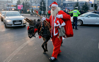 Ένας άνδρας φορώντας στολή Άι Βασίλη περπατάει με ένα γαϊδουράκι στην Πιάτρα Νεμτ της βόρειας Ρουμανίας. Μια παρέλαση πραγματοποιήθηκε στην πόλη λίγες μέρες πριν την αλλαγή του χρόνου.