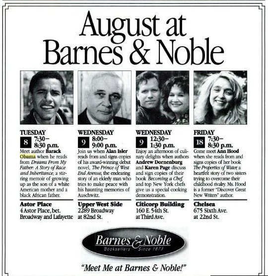 Σε αυτή τη διαφήμιση που «ξέθαψαν» κάποιοι «ποντικοί» του Διαδικτύου, ο Μπαράκ Ομπάμα εμφανίζεται ως ο συγγραφέας του βιβλίου «Dreams from My Father: A Story of Race and Inheritance» (Τα όνειρα του πατέρα μου: μια ιστορία φυλής και κληρονομιάς), το οποίο κυκλοφόρησε το 1995 και έκτοτε έχει ανατυπωθεί πολλές φορές. Η καταχώριση δημοσιεύθηκε στο περιοδικό New York Magazine, τον Αύγουστο του 1995.