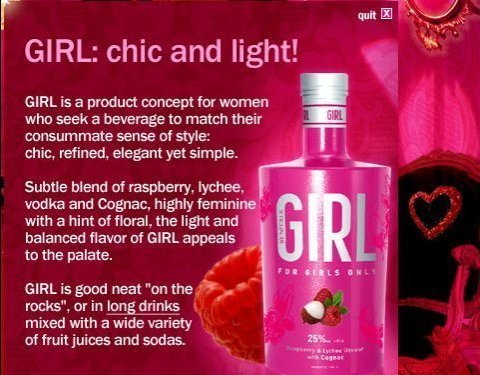 Το «Girl Liquor» προσπαθεί να προσελκύσει το γυναικείο πληθυσμό με το ροζ χρώμα του μπουκαλιού. Στη διαφήμιση για το ποτό οι υπεύθυνοι γράφουν ότι έχει αισθησιακό άρωμα και λίγες θερμίδες.