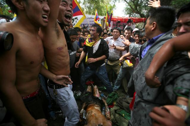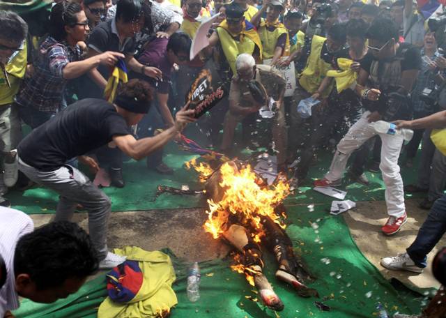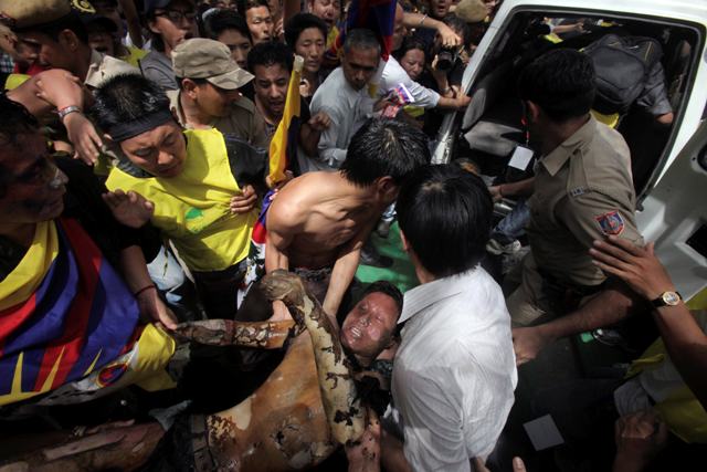 Στη συνέχεια κατέρρευσε στο οδόστρωμα ενώ δεκάδες διαδηλωτές προσπαθούσαν να σβήσουν τις φλόγες που τον έκαιγαν με τις σημαίες του Θιβέτ.