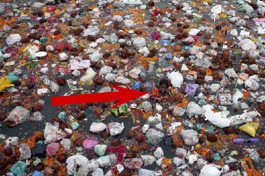 Μέσα στα νερά του μολυσμένου ποταμού Σαμπαρμάτι στην Ινδία, ο μικρός «κολυμβητής» της φωτογραφίας- που θα πρέπει να τον αναζητήσουμε με πολλή προσοχή για να τον εντοπίσουμε- αναζητεί θησαυρούς μέσα στα σκουπίδια, δηλαδή τυχόν προσφορές που έχουν πετάξει οι πιστοί στην πόλη Αχμενταμπάντ.