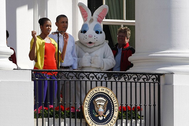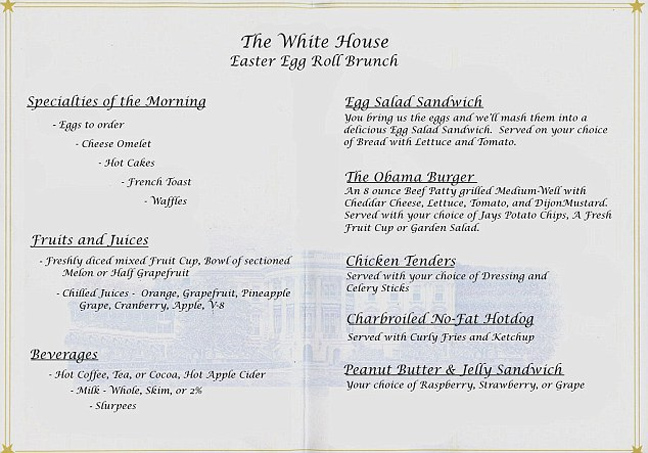 Το θέμα της πασχαλινής εκδήλωσης στο Λευκό Οίκο μπορεί να ήταν «Let’s Go, Let’s Play, Let’s Move!», ακολουθώντας την καμπάνια της Πρώτης Κυρίας των ΗΠΑ κατά της παχυσαρκίας, αλλά το μενού ήταν σε αντίθετη κατεύθυνση. Η οικογένεια Ομπάμα καλωσόρισε χιλιάδες παιδιά και τους γονείς τους προσφέροντας ένα μενού με βάφλες, τηγανιτές πατάτες και γλυκά.