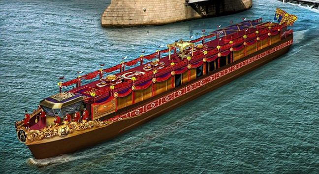 Στις φωτογραφίες που ακολουθούν αποτυπώνονται οι τελευταίες προετοιμασίες για τα διακοσμητικά της βασιλικής φορτηγίδας, του πλοίου-κοσμήματος που θα μεταφέρει τη βασίλισσα και τον πρίγκιπα Φίλιππο κατά μήκος του Τάμεση επικεφαλής νηοπομπής με περίπου χίλια πλοία.