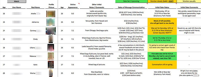 Συγκεκριμένα, ο επενδυτικός τραπεζίτης από τη Νέα Υόρκη, ο οποίος είναι μέλος της ιστοσελίδας online γνωριμιών Match.com, χρησιμοποιούσε τις λειτουργίες του Microsoft Excel για να καταγράφει με λεπτομέρεια τα στοιχεία κάθε γυναίκας, και δεν δίσταζε να καταγράφει ακόμα και εκθέσεις προόδου σχετικά την έκβαση κάθε ραντεβού του.