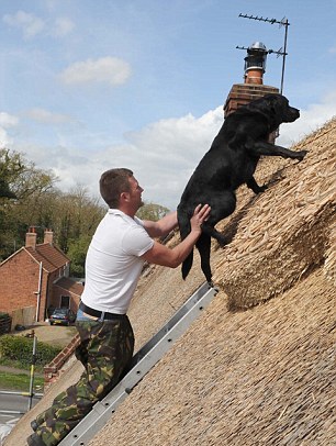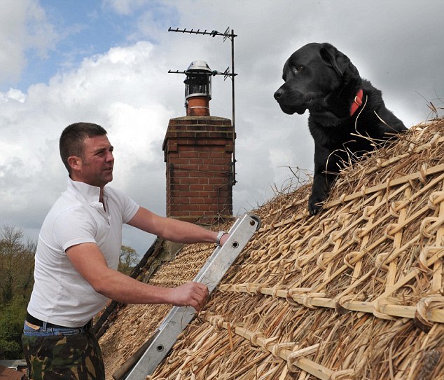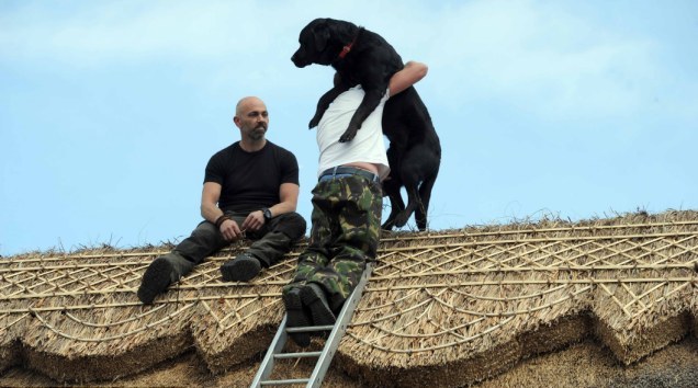 Όσοι τους βλέπουν από κάτω δυσκολεύονται να πιστέψουν στα μάτια τους. Δεν είναι δα και το πιο συνηθισμένο πράγμα στον κόσμο να βλέπει κανείς ένα σκύλο πάνω σε μια σκεπή!