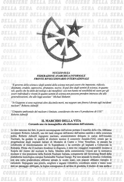 Η οργάνωση Fai (Άτυπη Αναρχική Ομοσπονδία) ανέλαβε την ευθύνη της επίθεσης κατά του Ρομπέρτο Αντινόλφι, διευθυντή της εταιρείας Ansaldo Nucleare, κάνοντας αναφορά, σε προκήρυξή της, στην Ελληνίδα αναρχική Όλγα Οικονομίδου.
