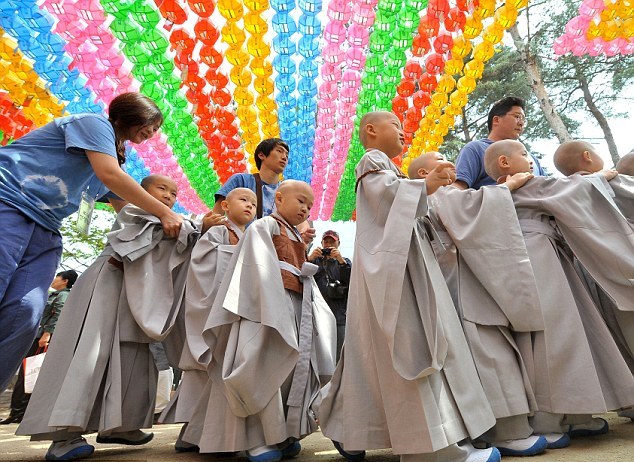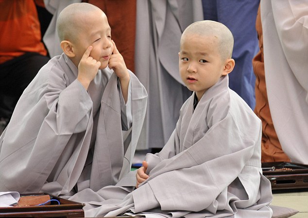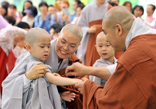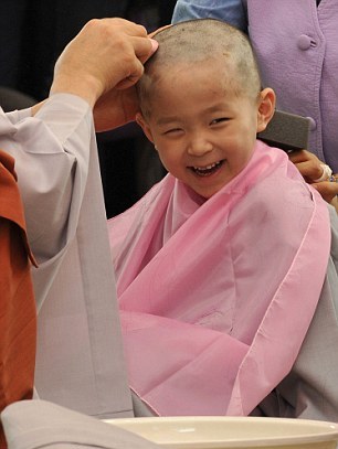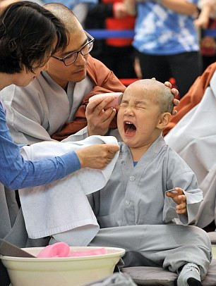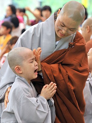 Ξεσπούν σε γοερά κλάματα καθώς ξυρίζουν το κεφάλι τους για πρώτη φορά, στο πλαίσιο της τελετουργίας που ακολουθείται στον ιερό ναό Jogye στην πρωτεύουσα της Νότιας Κορέας.