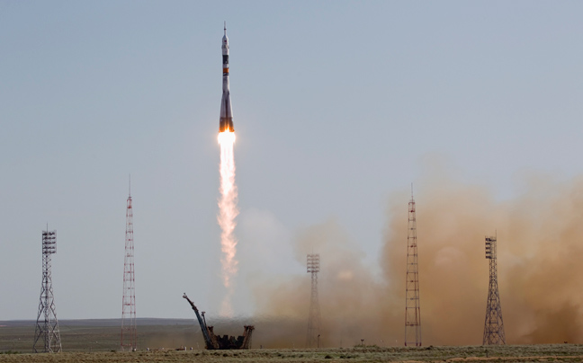 Με πλήρωμα τρεις αστροναύτες, δύο Ρώσους κι έναν Αμερικανό, το διαστημόπλοιο Σογιούζ εκτοξεύτηκε πριν λίγο από το κοσμοδρόμιο του Μπαϊκονούρ με προορισμό τον Διεθνή Διαστημικό Σταθμό, όπου αναμένεται να προσδεθεί αύριο.