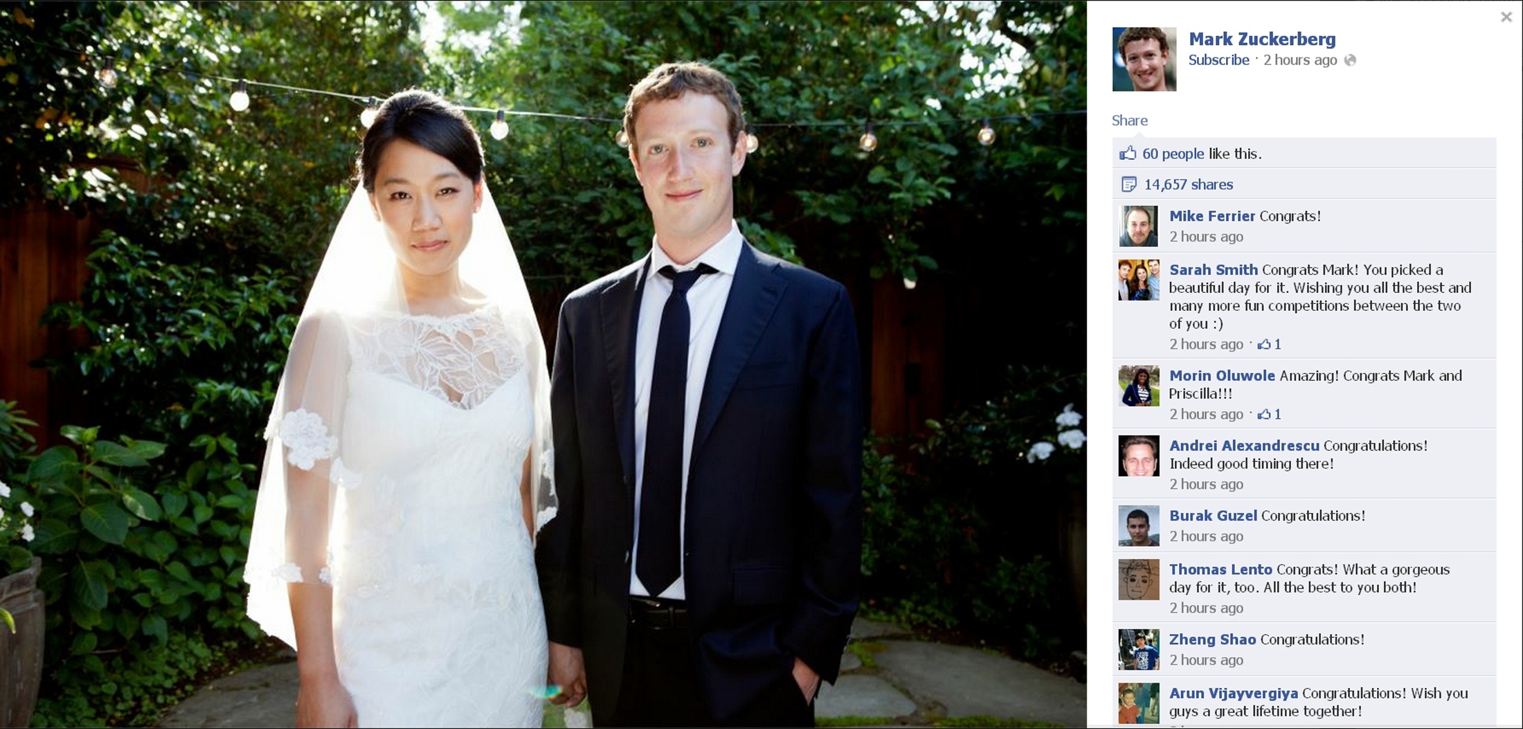 Την εκλεκτή της καρδιάς του και επί χρόνια φίλη του Πρισίλα Τσαν παντρεύτηκε ο συνιδρυτής του Facebook Μαρκ Ζούκερμπεργκ και όπως ήταν αναμενόμενο, ανακοίνωσε το γάμο τους στο δίκτυο κοινωνικής δικτύωσης, αλλάζοντας το status του.