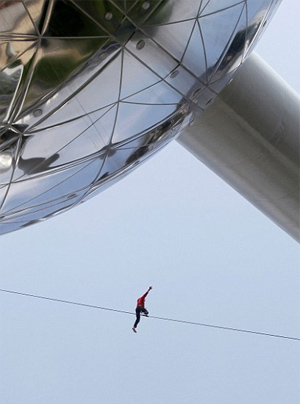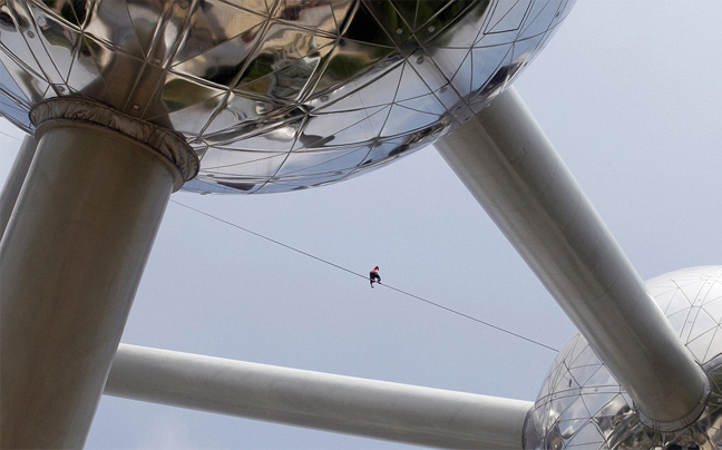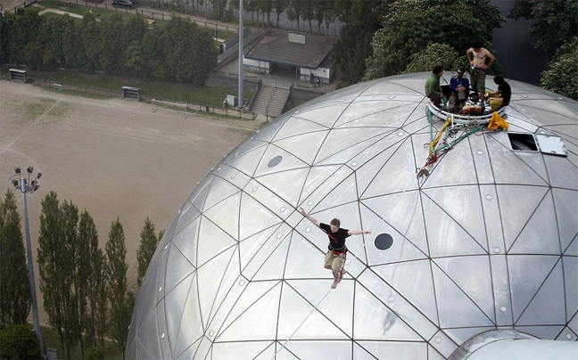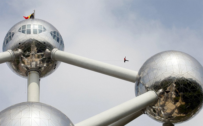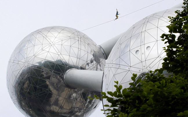 Άπλετη θέα των Βρυξελλών μπορεί να απολαύσει όποιος επισκεφθεί το μνημείο Ατόμιουμ στο Βέλγιο. Αλλά για μία ομάδα σχοινοβατών η θέα μέσα από τις σφαίρες του μνημείου δεν ήταν αρκετή…