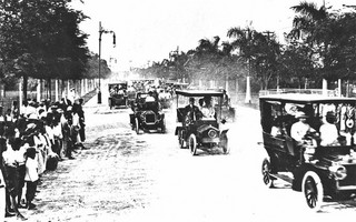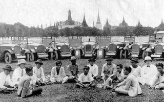 Μια φωτογραφία παρουσιάζει μια πομπή αυτοκινήτων κατά μήκος της Βασιλικής Λεωφόρου, και στο βάθος διαφαίνεται το Wat Phra Kaew, ο Ναός του Σμαραγδένιου Βούδα στη Λεωφόρο Rajdamnern.