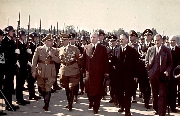 Ο Βρετανός πρωθυπουργός Νέβιλ Τσάμπερλειν (πρώτη σειρά, δεύτερος από δεξιά) περνάει μπροστά από το άγημα των Ναζί πηγαίνοντας να συναντήσει τον Χίτλερ (28 Σεπτ. 1938).