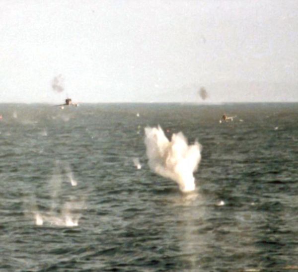 Ένας ατρόμητος φωτογράφος κατέγραψε στο φακό του την επίθεση δύο μαχητικών αεροσκαφών της Αργεντινής και συγκεκριμένα τη στιγμή που πυροδοτούσαν το πλοίο, πάνω στο οποίο βρισκόταν ο ίδιος.