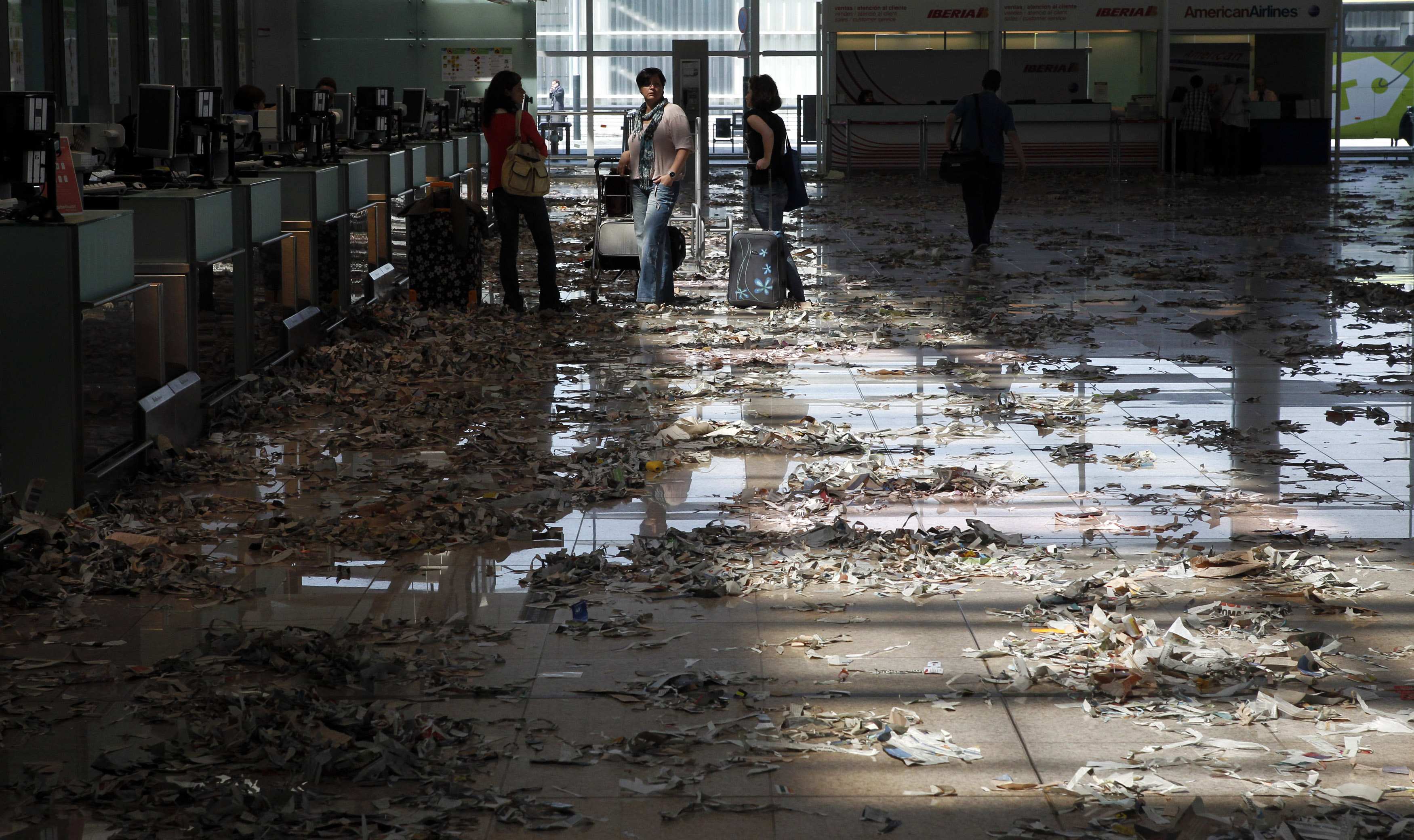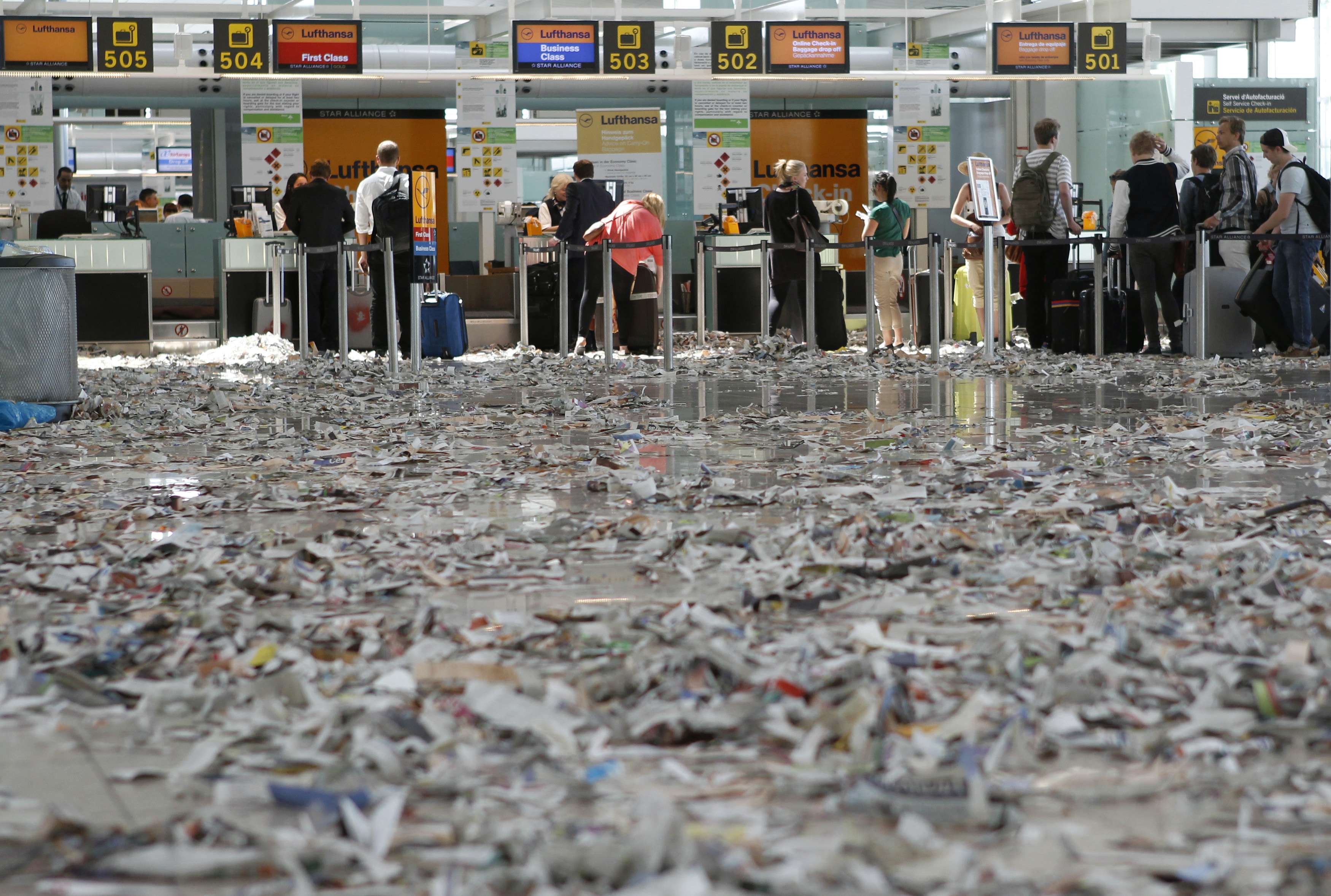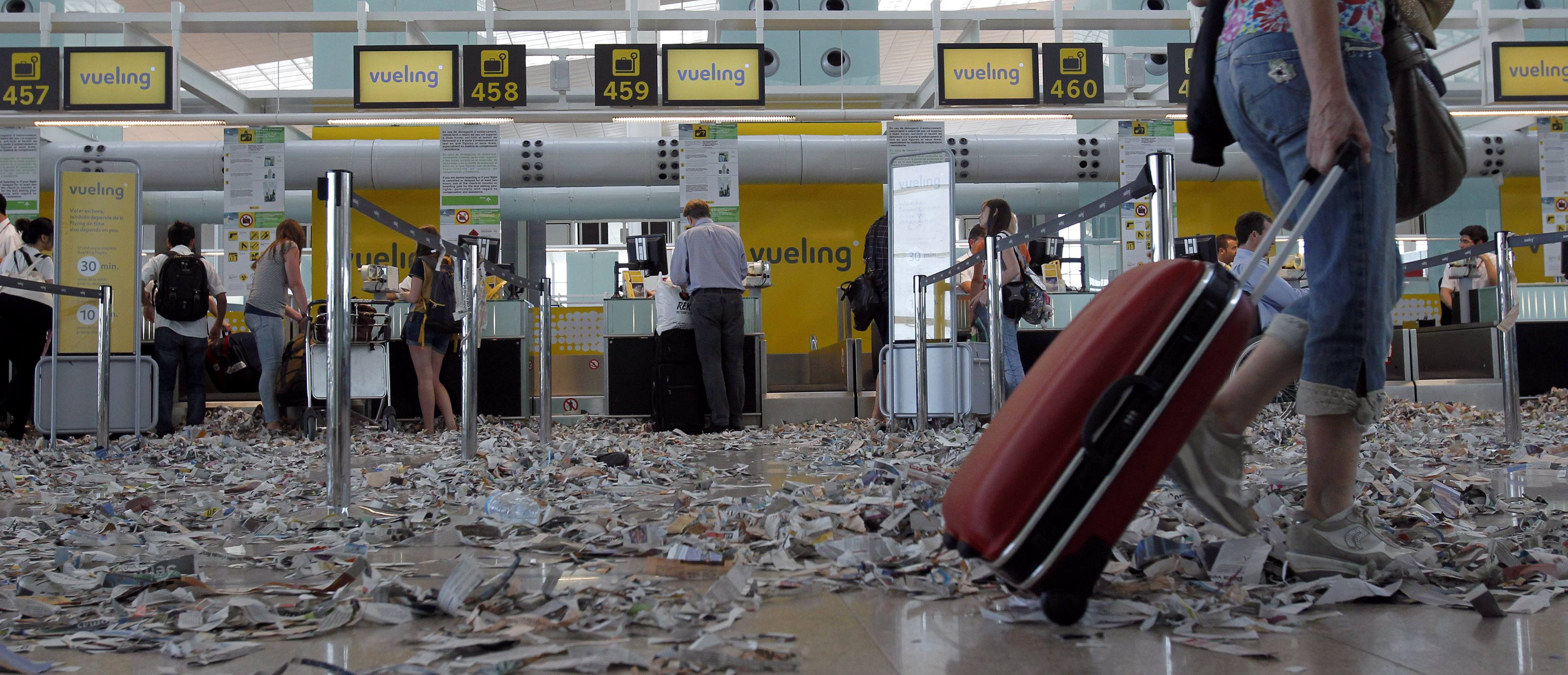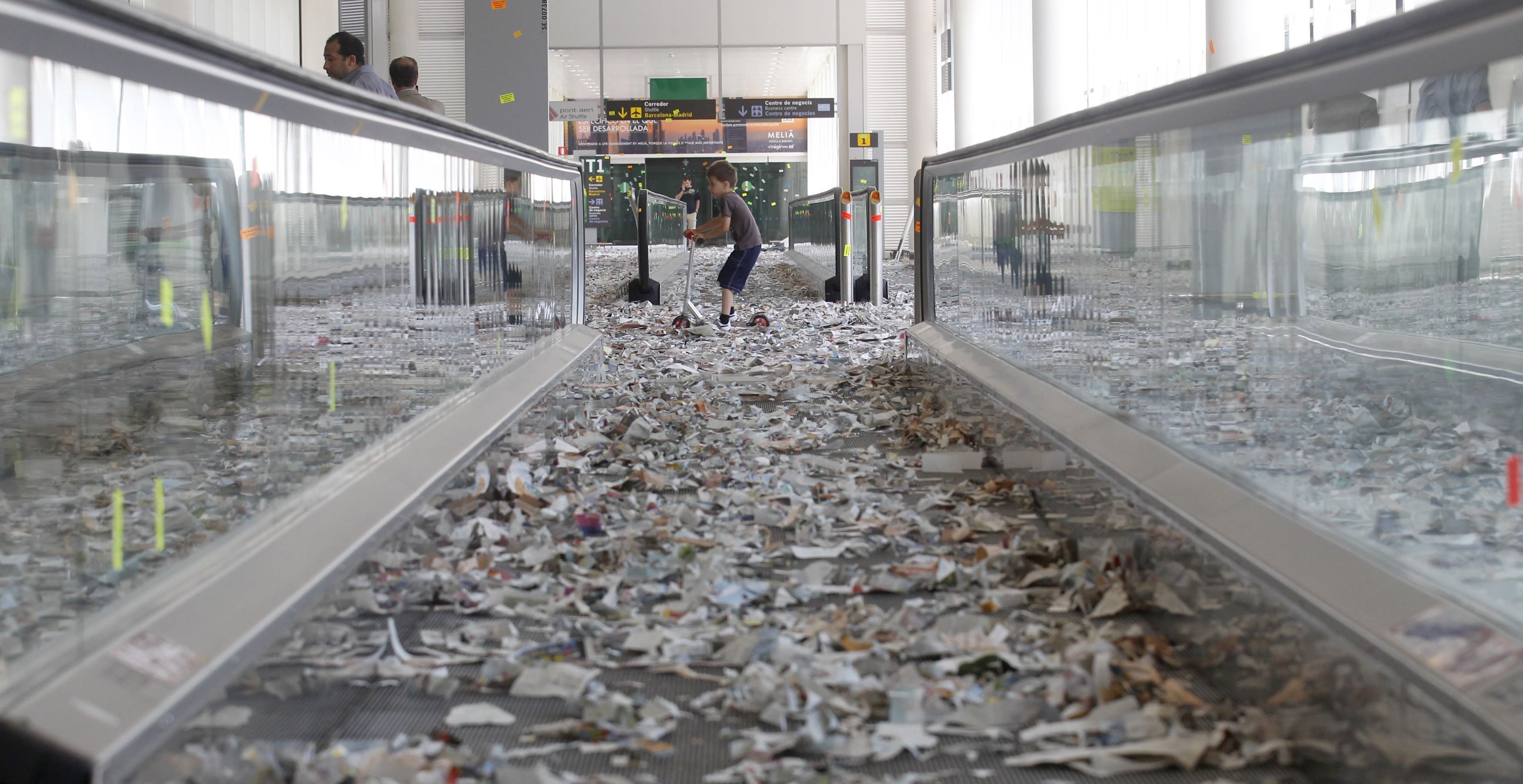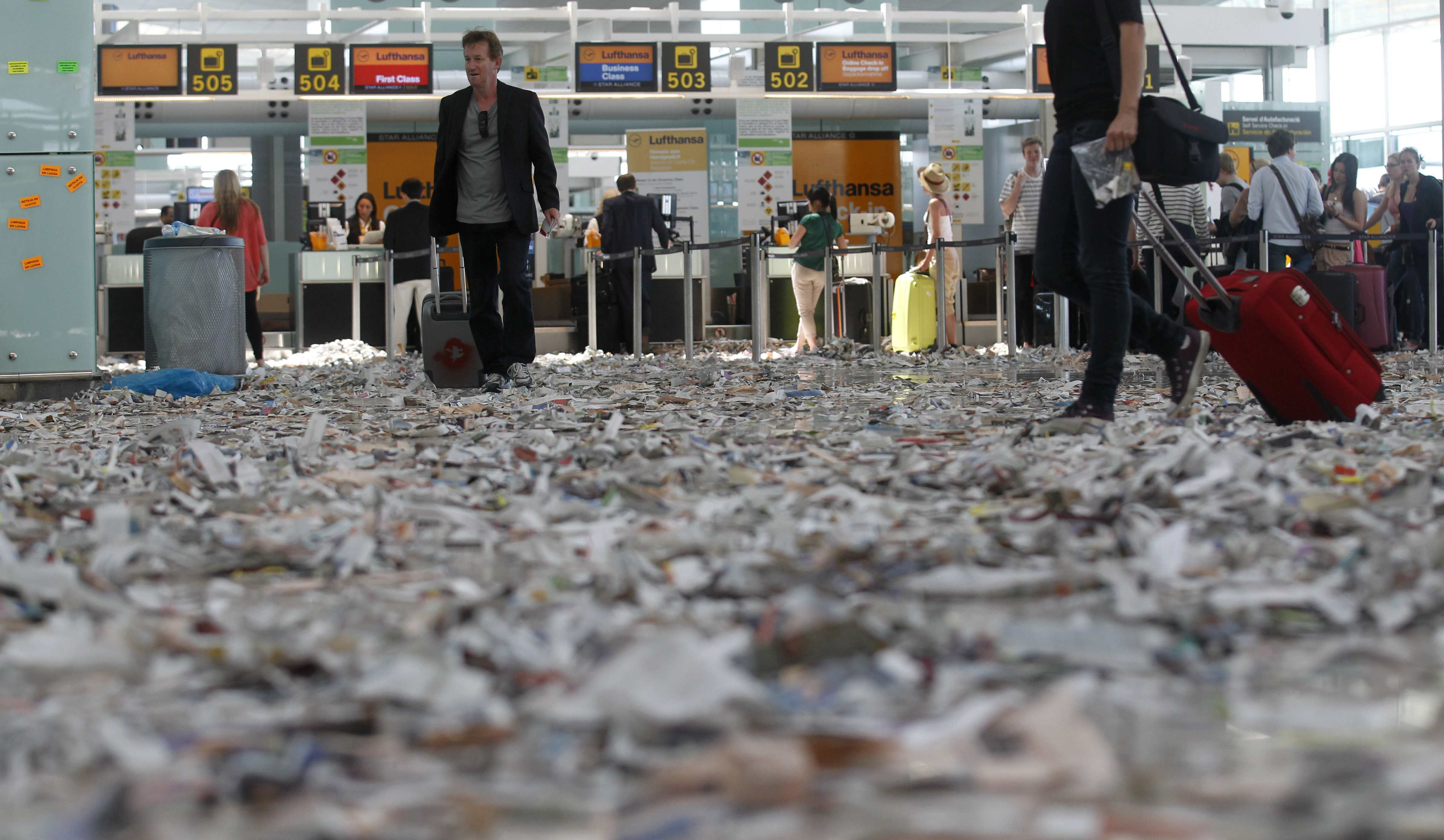 Έναν πρωτότυπο τρόπο διαμαρτυρίας βρήκαν οι εργαζόμενοι στην καθαριότητα του αεροδρομίου της Βαρκελώνης. Γέμισαν τους χώρους αναμονής με σκισμένα χαρτιά δημιουργώντας μία πολύ διαφορετική εικόνα στους επιβάτες του αεροδρομίου.