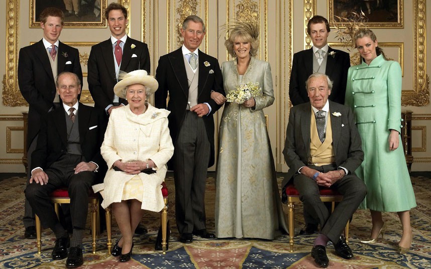 9 Απριλίου 2005: Ο πρίγκιπας της Ουαλίας και η δούκισσα της Κορνουάλης Καμίλα, φωτογραφίζονται με τις οικογένειες τους μετά το γάμο τους στο κάστρο του Windsor.