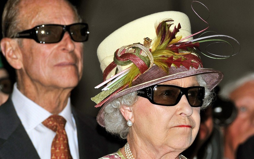 5 Ιουλίου 2010: Φορώντας τρισδιάστατα γυαλιά η Ελισάβετ και ο δούκας του Εδιμβούργου παρακολουθούν ταινία στα στούντιο Pinewood στο Τορόντο.