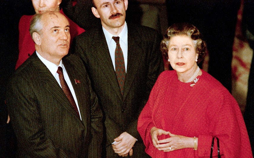 7 Απριλίου1989: Ο ηγέτης της Σοβιετικής Ένωσης Μιχαήλ Γκορμπατσόφ συζητά με τη βασίλισσα στο κάστρο του Windsor στο τέλος της επίσημης επίσκεψης του στη Βρετανία.