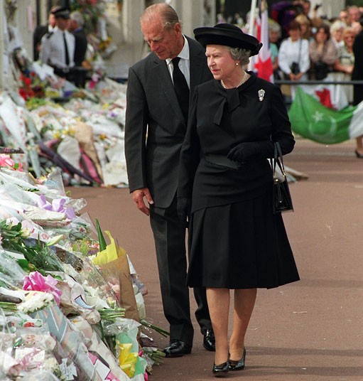 Σεπτέμβριος 1997: Η Ελισάβετ και ο δούκας του Εδιμβούργου κοιτάζουν τα λουλούδια που οι πολίτες έχουν αφήσει έξω από τα ανάκτορα μετά το θάνατο της πριγκίπισσας Νταϊάνα.