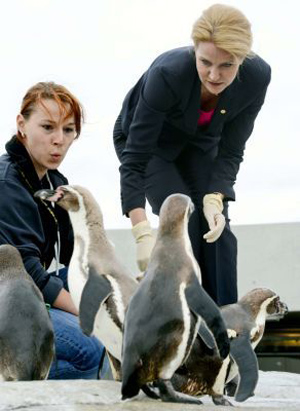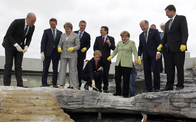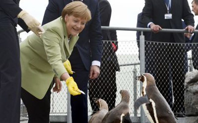 Μία ημέρα μετά τις εξαγγελίες Μέρκελ για λιτότητα και δημοσιονομική πειθαρχία από τη Σύνοδο Κορυφής των χωρών της Βαλτικής, η γερμανίδα καγκελάριος μαζί με άλλους ηγέτες που συμμετείχαν στη σύνοδο, η οποία πραγματοποιήθηκε στο Στράλσουντ της βόρειας Γερμανίας, επισκέφθηκαν τους πιγκουίνους στο Oceaneum , τους οποίους μάλιστα τάισαν.