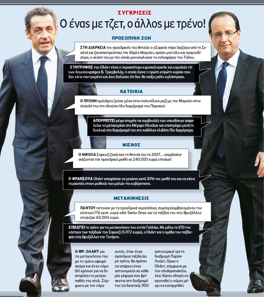 Απέναντι σε έναν Σαρκοζί που αύξησε τον μισθό του, δεν αποχωριζόταν το πανάκριβο προεδρικό τζετ, που ζούσε σε πανάκριβο προάστιο του Παρισιού και ο γάμος του με την Ιταλίδα καλλονή, Κάρλα Μπρούνι γινόταν καθημερινά πρωτοσέλιδο, ο Ολάντ είναι ο άνθρωπος της διπλανής πόρτας που διατηρεί την επαφή του με τον κόσμο: έκανε περικοπές στον μισθό του προέδρου, χρησιμοποιεί το τρένο ακόμα και για τις επίσημες επισκέψεις του και αποφάσισε να μη μεταφερθεί για την ώρα στο Μέγαρο των Ηλυσίων και να συνεχίσει να ζει στο διαμέρισμά του με τη χαμηλών τόνων σύντροφό του, Βαλερί Τριερβελέρ και τους γιους της.
