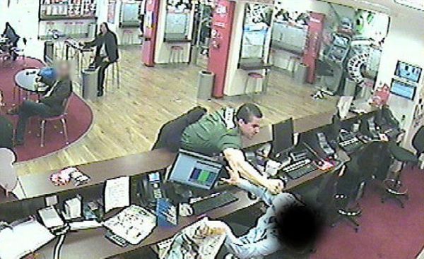 Το κλειστό κύκλωμα τηλεόρασης ενός πρακτορείου τυχερών παιχνιδιών στη Βρετανία κατέγραψε τη συγκλονιστική στιγμή, όταν ένας άνδρας που έχασε στο στοίχημα, άρχισε να γρονθοκοπεί βίαια την ταμία του μαγαζιού στο πρόσωπο.