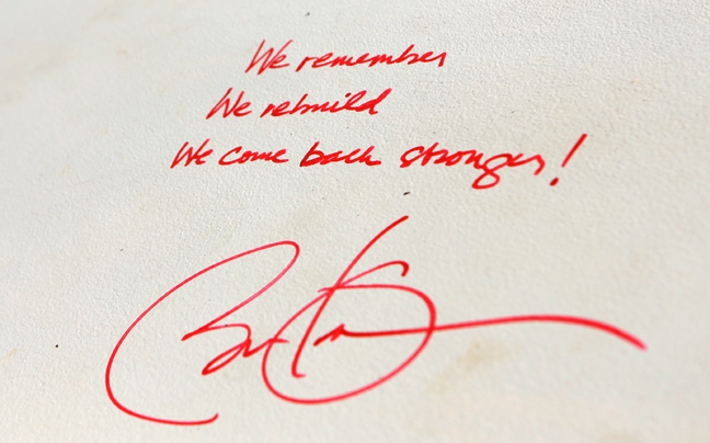 «Σας θυμόμαστε, ανοικοδομούμαστε, επανερχόμαστε δυνατότεροι», έγραψε ο Ομπάμα στη διάρκεια της επίσκεψής του στον πύργο «1 World Trade Center», μαζί με το δήμαρχο της Νέας Υόρκης Μάικλ Μπλούμπεργκ και τους κυβερνήτες της Νέας Υόρκης Άντριου Κουόμο και του Νιου Τζέρσι Κρις Κρίστι.