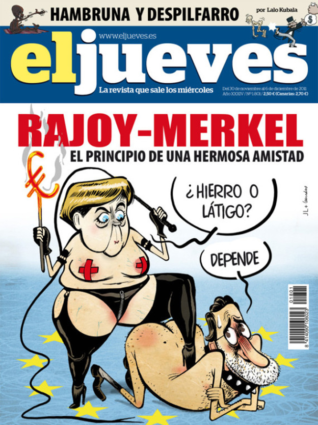 «Μέρκελ- Ραχόι, η αρχή μιας βαθιάς φιλίας» είναι ο τίτλος πρωτοσέλιδου ισπανικού περιοδικού που δείχνει τη Γερμανίδα καγκελάριο σε σαδομαζοχιστικές πρακτικές με τον Ισπανό πρωθυπουργό.