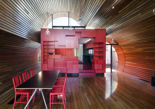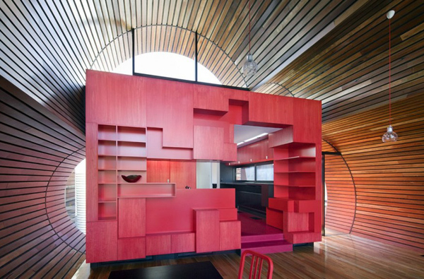 Το «συννεφόσπιτο» συνδέεται με το υπόλοιπο σπίτι, που παρέμεινε στην αρχική του διατηρητέα εκδοχή, μέσω του τεράστιου κόκκινου τετραγώνου, που λειτουργεί ως κουζίνα. Ή, αν θες, σαν την καρδιά του σπιτιού! Πραγματικά μοναδικό.