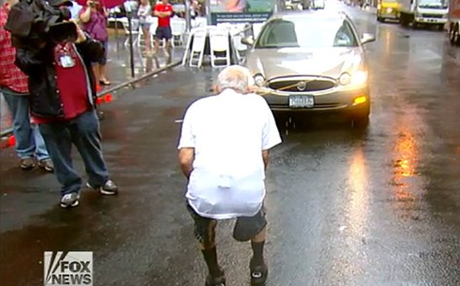 Γιορτάζοντας την 4η Ιουλίου ο μικροσκοπικός βετεράνος του Β’ Παγκοσμίου Πολέμου έδειξε πως έχει δόντια από… ατσάλι, τραβώντας την Μπιούικ του στην 48η οδό στη Νέα Υόρκη.